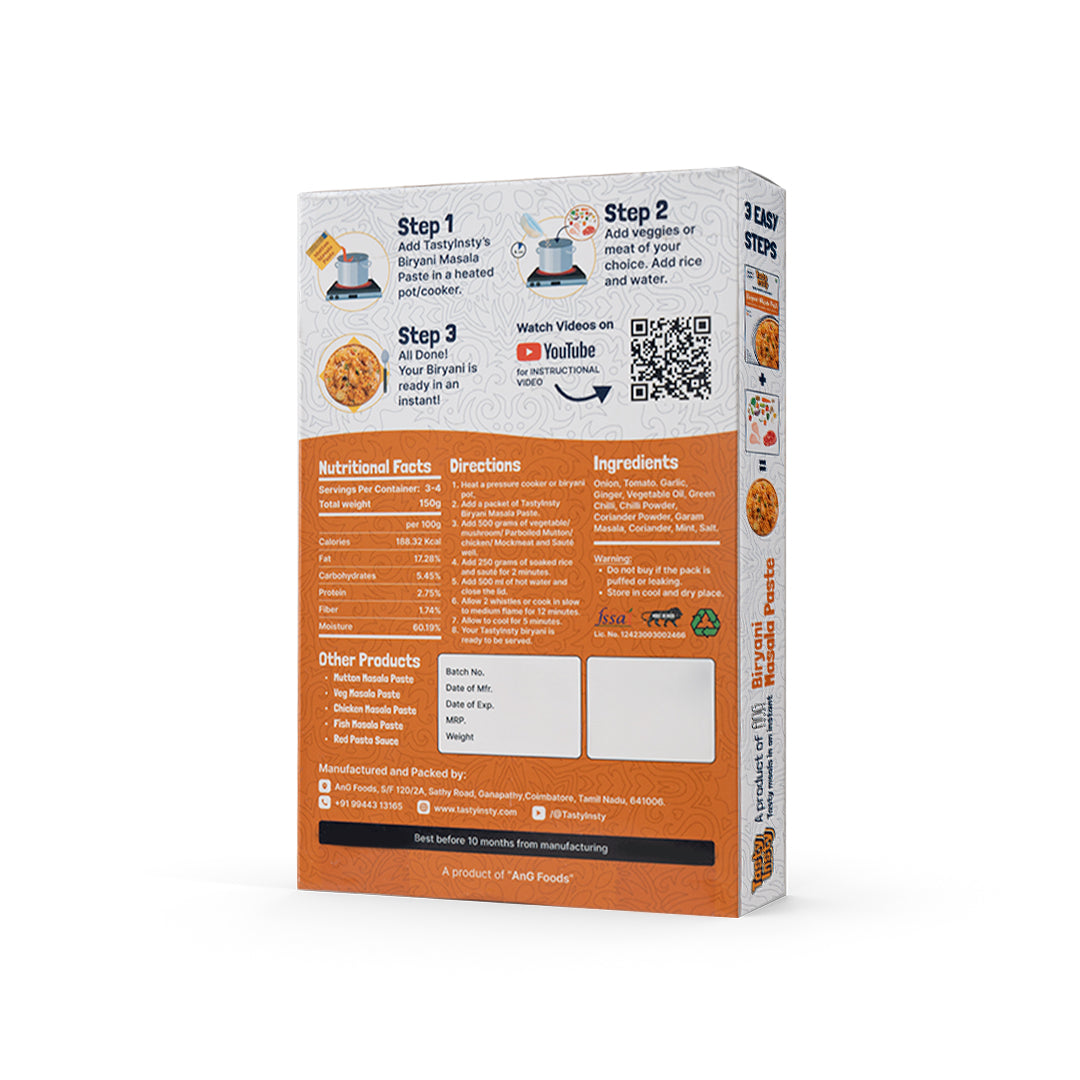 Tasty Insty's Biryani Masala Paste is your shortcut to delicious veg or non-veg biryani. Just mix with rice and your choice of protein or veggies.